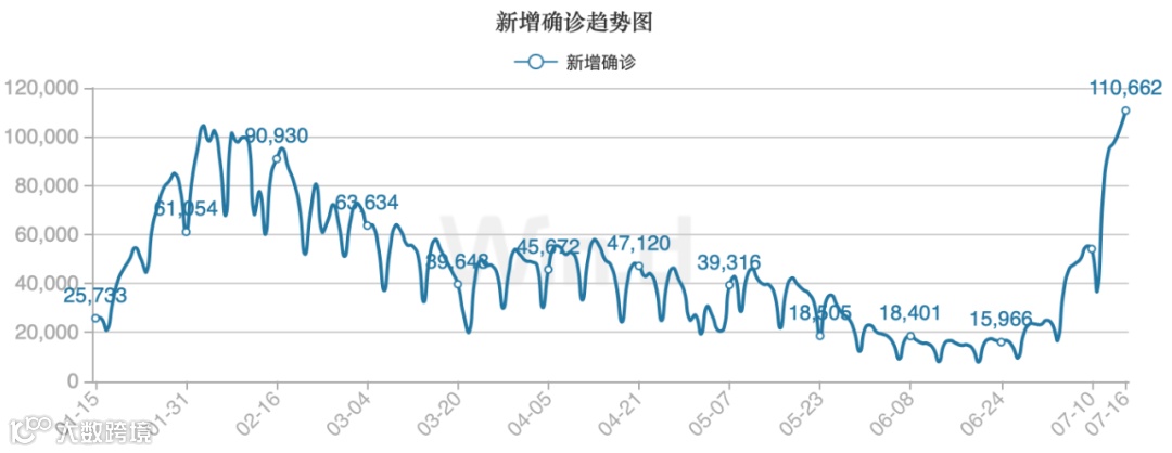 亚洲地区的疫情形势也不容乐观,据共同社消息,日本7月16日新增新冠确诊病例首次超过11万例,创下新冠疫情暴发以来单日新高,奥密克戎毒株亚型BA.5的感染者占比现阶段已达到近八成,东京已经将新冠疫情警报升至最高级别;韩国中央防疫对策本部7月17日通报,前一日新增确诊病例40342例,较一周前翻番,官员和专家预计,到8月中旬至9月底,韩国单日新增病例可能将达到20万例。