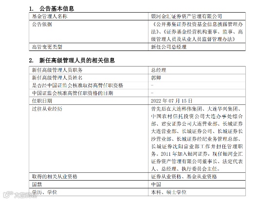 公告信息显示,7月15日起,郭卿出任银河金汇资管总经理。