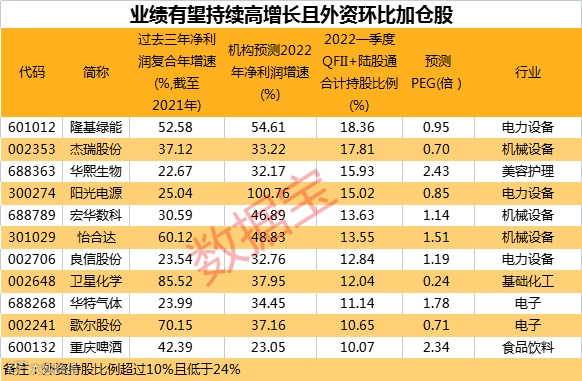 数据宝统计,今年一季度外资持股(QFII+北上资金)环比加仓股超千只,外资持股比例超过10%但低于24%,且过去三年(截至2021年)净利润复合增速、机构预测2022年、2023年净利润增速均超过20%的公司仅有11家,主要分布在电力设备、机械设备及电子等热门赛道,包括阳光电源、宏华数科、华特气体等。