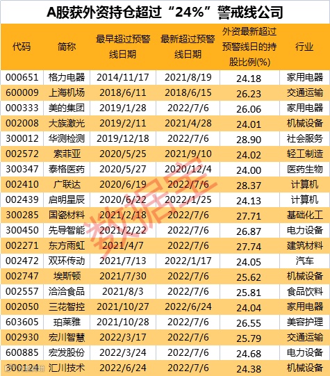 20家超过预警线的公司中,有8家公司近期不再披露外资持股比例,意味着当前这些公司获外资的持股比例低于24%,包括格力电器、上海机场、大族激光,这3家公司是较早一批获外资大比例买入的公司。