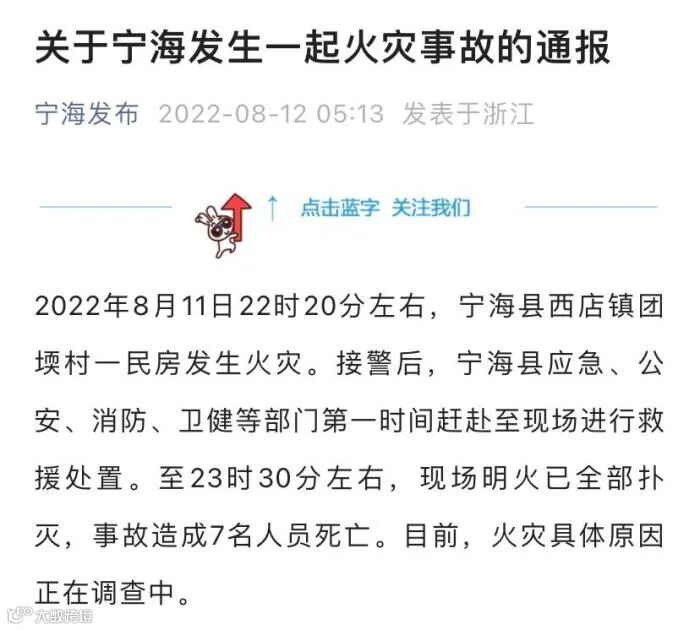 8月12日,据浙江省宁波市宁海县最新通报,该县一民房发生火灾,造成7名人员死亡。8月11日22时20分左右,宁海县西店镇团堧村一民房发生火灾。接警后,宁海县应急、公安、消防、卫健等部门第一时间赶赴至现场进行救援处置。截至8月11日23时30分左右,现场明火已全部扑灭,事故造成7名人员死亡。目前,火灾具体原因正在调查中。