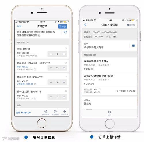 通过使用小步外勤,业务员可以在每次给客户补货之后及时提交订单,上报订单的商品名、数量和是否折扣等等,领导能依据订单清晰地知晓每位客户在何时补了多少货。