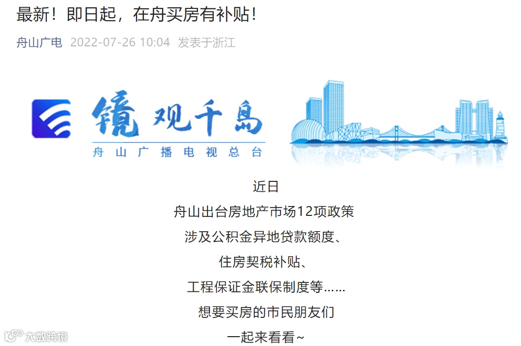 7月26日,“舟山广电”公众号文称,舟山出台房地产市场12项政策,涉及公积金异地贷款额度、住房契税补贴等。