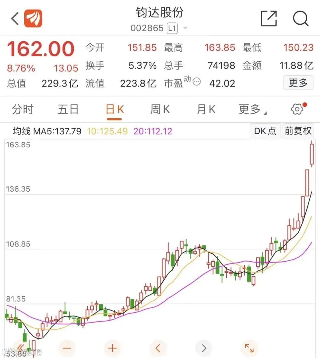 7月28日,光伏板块再度活跃,钧达股份早盘盘中加速涨停,截至收盘报162.00元,大涨超8.5%。钧达股份股价在2020年7月到2022年7月的104个交易周内,实现十倍涨幅,累计涨幅达1063%。