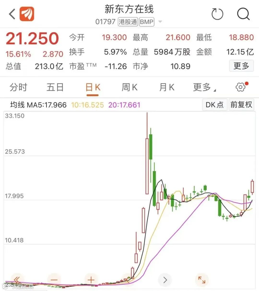 7月28日,新东方在线和新东方港股双双大涨。截至发稿,新东方在线股价重回21港元上方,涨超16%,新东方现涨超7%。