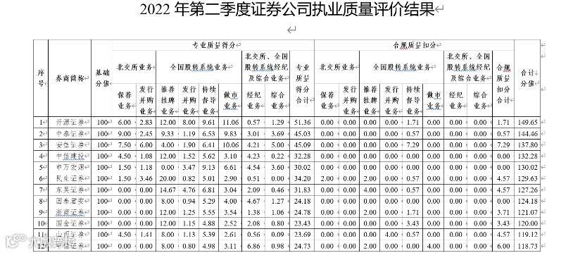 根据昨天发布的二季度主办券商执业质量评价结果显示,其中合计分值排名前10的券商分别为开源证券、中泰证券、安信证券、中信建投、申万宏源、民生证券、东吴证券、国泰君安、浙商证券、国金证券。排名居前的开源证券、安信证券、申万宏源等券商大多都是有北交所、新三板业务特色的券商。