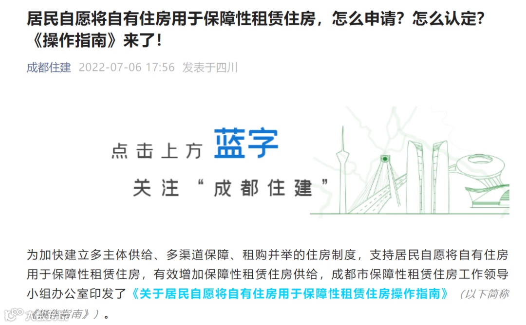7月6日,成都发布了《关于居民自愿将自有住房用于保障性租赁住房操作指南》(以下简称《操作指南》),其中明确,住房纳入保障性租赁住房房源库后,居民即可申请在出租住房所在限购区域取得新增购买一套住房资格。
