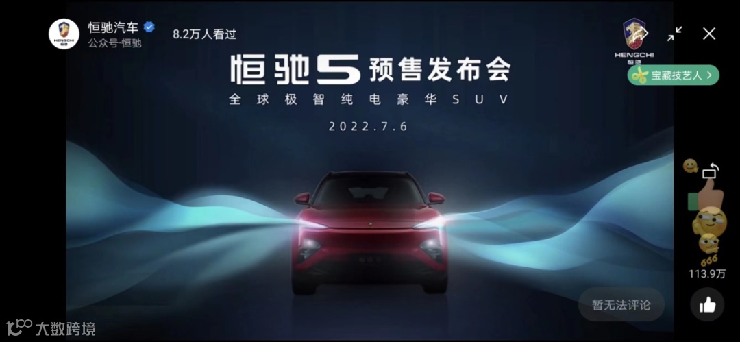 7月6日,恒大汽车恒驰5的预售发布会,合计在线观看人数近10万人。