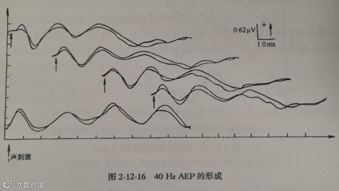 40Hz AEP的波形类似于正弦波,峰间隔约25ms。振幅一般大于1 μV。随刺激强度降低,振幅下降,但峰潜伏期不变。