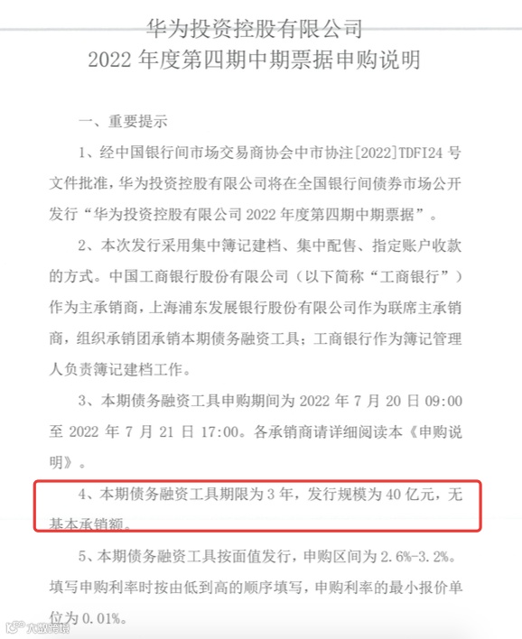 7月19日,华为披露今年第四期中期票据申购说明,发行规模40亿元,期限3年,申购期为7月20日9时至21日17时,申购利率区间为2.6%~3.2%。