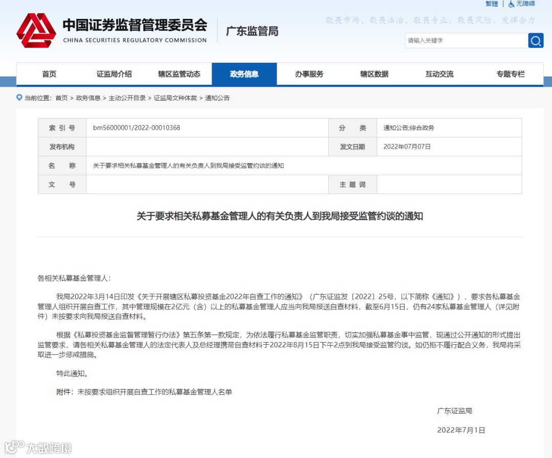 根据《私募投资基金监督管理暂行办法》第五条第一款规定,为依法履行私募基金监管职责,切实加强私募基金事中监管,现通过公开通知的形式提出监管要求,请各相关私募基金管理人的法定代表人及总经理携带自查材料于2022年8月15日下午2点到广东证监局接受监管约谈。如仍拒不履行配合义务,该局将采取进一步惩戒措施。