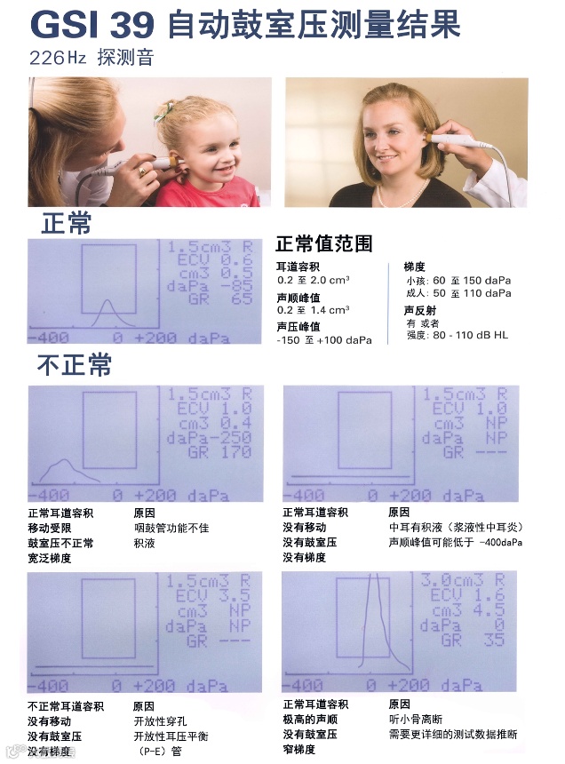 所有仪器都有一个特设的一体探头,它具有226HZ和1000Hz的测量能力在显示屏和打印的报告上,有一个方框,它表示婴儿正常值的范围,这些婴儿的正常值是根据马戈利斯(Mar-golis)等人发表的数值,表示足月婴儿第5%,50%和95%的数值。