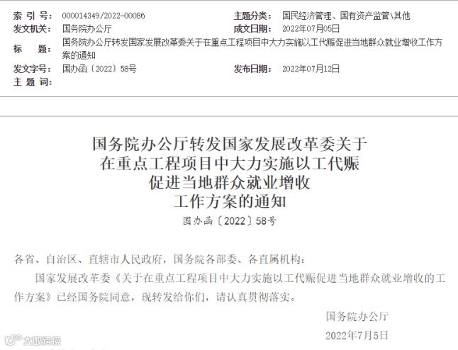 7月12日,国务院办公厅同意并公布国家发展改革委《关于在重点工程项目中大力实施以工代赈促进当地群众就业增收工作方案》(下称《工作方案》)