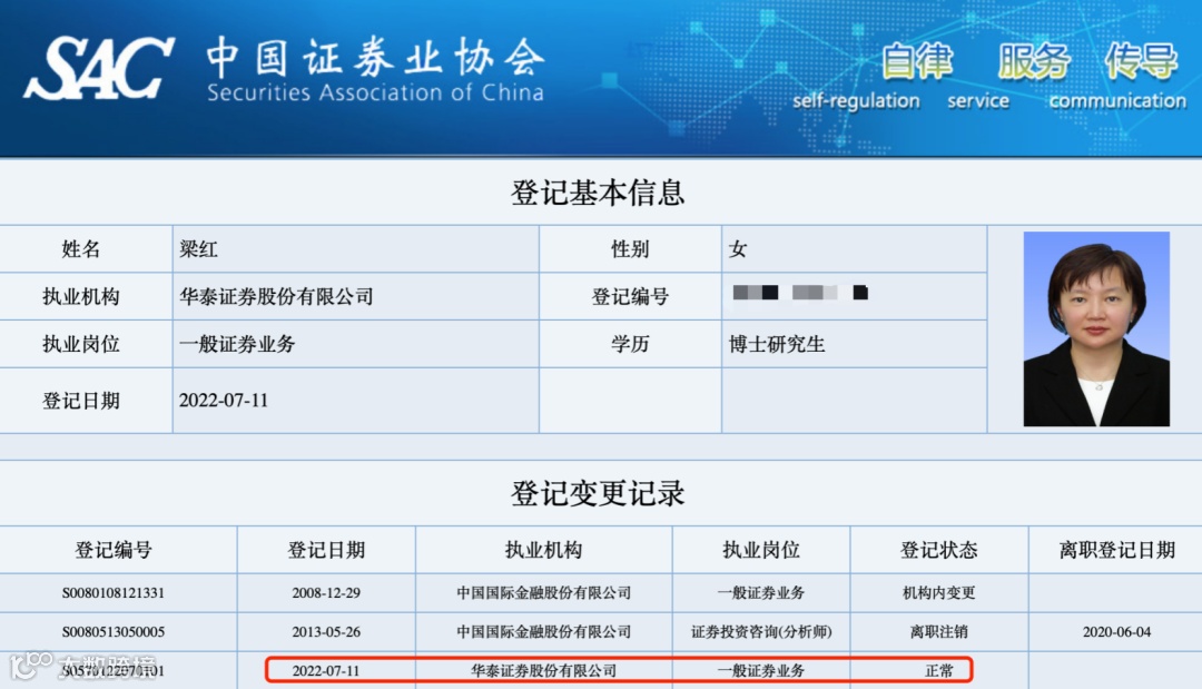 7月11日,原高瓴产业与创新研究院院长梁红在中证协的公示信息更新,新的执业机构是华泰证券,但执业岗位却并非是分析师,而是一般证券业务。据券商中国记者了解,梁红日前已经悄然加入华泰证券,并出任机构业务委员会联席主席一职。