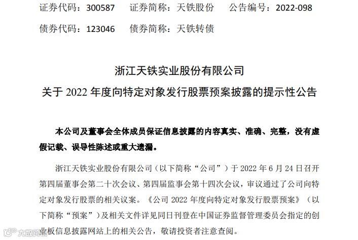 6月24日晚间天铁股份(300587)公告,公司拟定增募资25.53亿元,扣除发行费用后全部用于补充公司流动资金。公司控股股东、实际控制人之一王美雨将认购天铁股份本次发行的全部股票。
