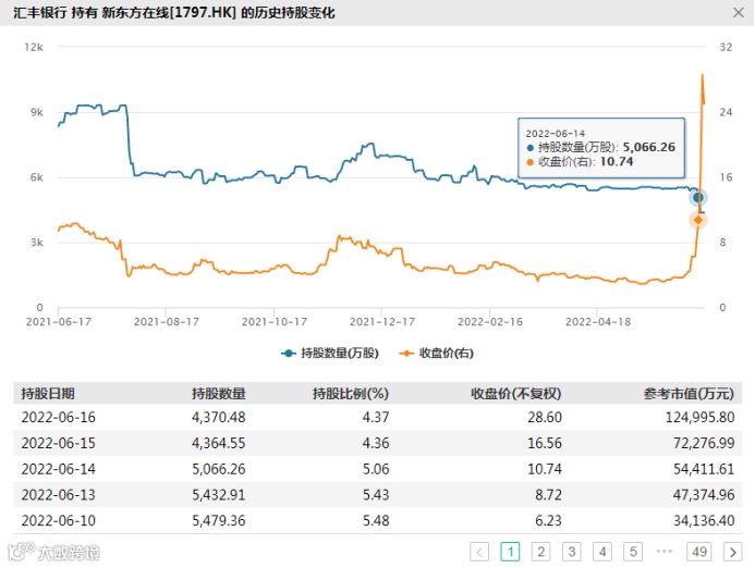 此外,汇丰银行、盈透证券等外资机构也在近日减持了不少新东方在线仓位。数据显示,6月13日,汇丰银行持有新东方在线5432.91万股,但6月14日持仓减少366.65万股至5066.26万股,环比减持幅度达6.75%。6月15日,汇丰银行继续减持,当天减持了701.71万股,环比减持幅度达13.85%。