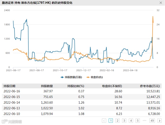 证券时报记者观察各中资证券经纪商发现,券商持有新东方在线股数也是爆发式增加。富途证券持有新东方在线6月15日一天时间增加了320万股,持仓股数增至2088万股。
