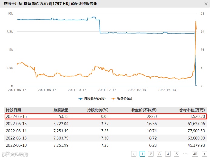 Wind数据显示,摩根士丹利去年年底以来持有新东方在线股数始终在7300万股左右,但近期随着新东方在线股价暴涨,摩根士丹利6月15日、6月16日连续大幅减持。