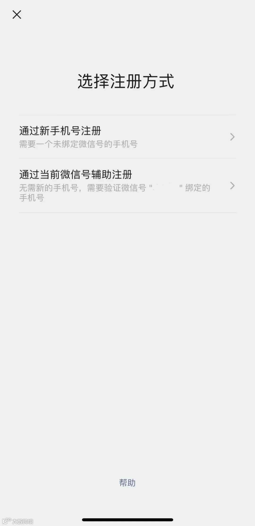 选择“注册一个新账号”后,点击下方的“通过当前微信号辅助注册”,下面小字显示,无需新的手机号,只需验证大号就能注册。