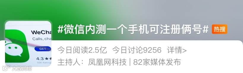 近日,有网友反映,微信正在内测开放小号功能,同一个手机可以注册两个微信账号。 相关话题火速冲上热搜引发网友讨论。