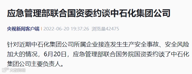 针对近期中石化集团公司所属企业接连发生生产安全事故、安全风险加大的情况,6月20日,应急管理部联合国务院国资委约谈了中石化集团公司主要负责人。