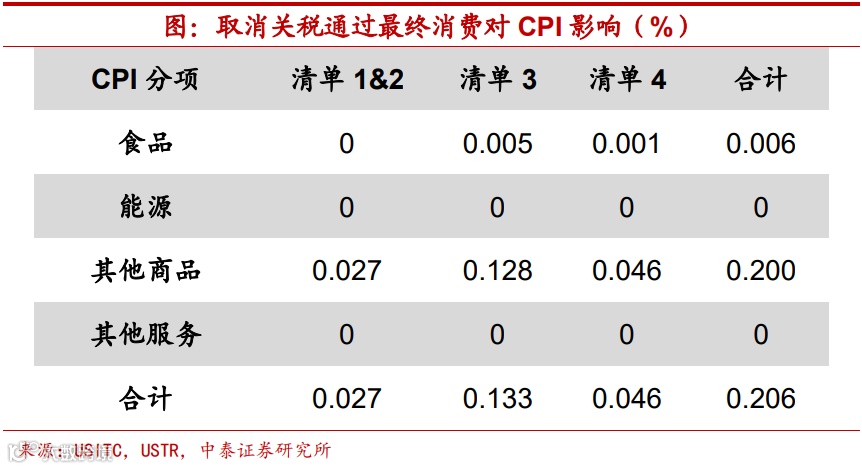 最终消费路径下降0.21%,多数体现在核心CPI。Amiti et al. (2019)的研究结果显示,美国对中国进口商品加征的关税主要由美国进口商承担,而关税下降1%约导致进口价格下降0.95%。我们整理了美国自中国进口的各类商品关税税率变化,并进一步地将美国从中国进口商品(HS10位码)与美国各行业编码进行匹配,进而再与CPI分项进行匹配,从而得到进口商品价格变动到CPI变动之间的映射关系。我们的测算结果表明,取消现有加征关税,通过最终消费品价格变动途径,会带动CPI增速下降0.2个百分点左右,而影响多数集中在商品分项上,几乎不会带来食品、能源和其它服务价格的显著变化。这也意味着该影响在核心CPI增速上会有较大体现