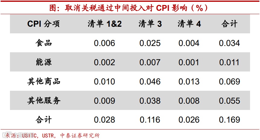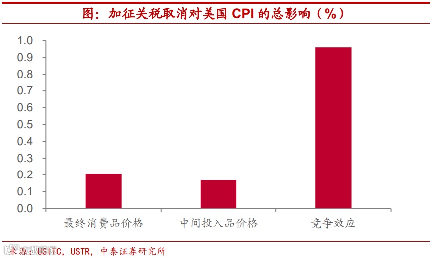总影响超过1.3%,取消关税切实有效。通过关税对价格三种传导路径的影响效果估计,总结来看,美国对我国出口商品加征关税的取消,对其CPI增速带来的总影响约为1.34%,考虑到美联储一直以来维持CPI增速在2%-3%水平的努力,取消加征关税的影响并不算低。从关税调整给物价带来的总影响来说,通过最终消费品价格变动和中间投入品价格变动所产生的影响约为0.38%,占到总影响的比重不到三成。现有部分研究在估测关税调整影响时忽略了竞争效应,进而低估了通胀下降的幅度。