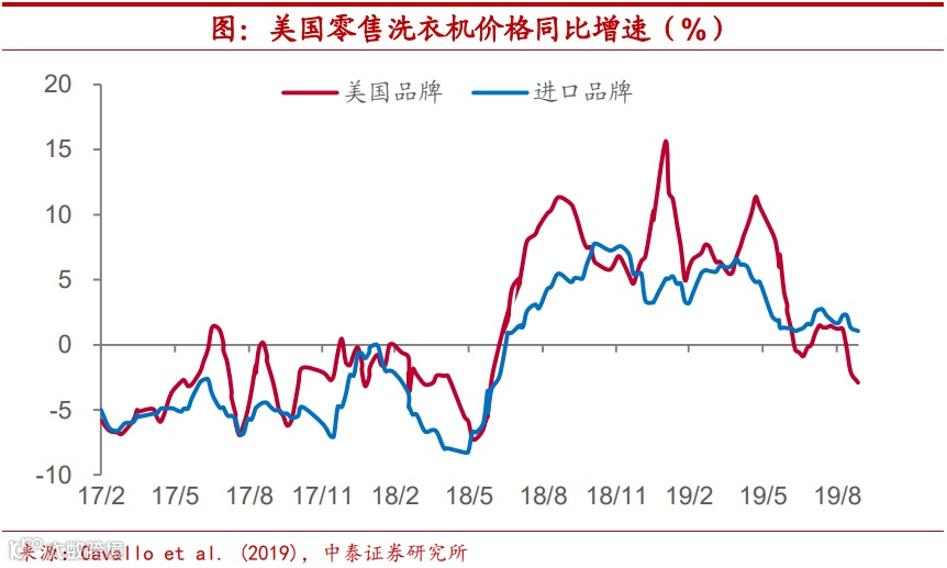 竞争效应最为显著,对CPI影响约0.96%。Cavallo et al. (2019)等人对美国零售商近十万种商品价格变动的研究发现,当某一品类产品进口价格由于加征关税而上升时,相应的国内生产的产品价格也会同步上升,这即是竞争效应在起作用。根据PIIE基于美国对中国出口商品加征关税情况所建立的一般均衡模型估计,现有加征关税措施通过竞争效应对美国CPI增速的影响约在0.96个百分点。