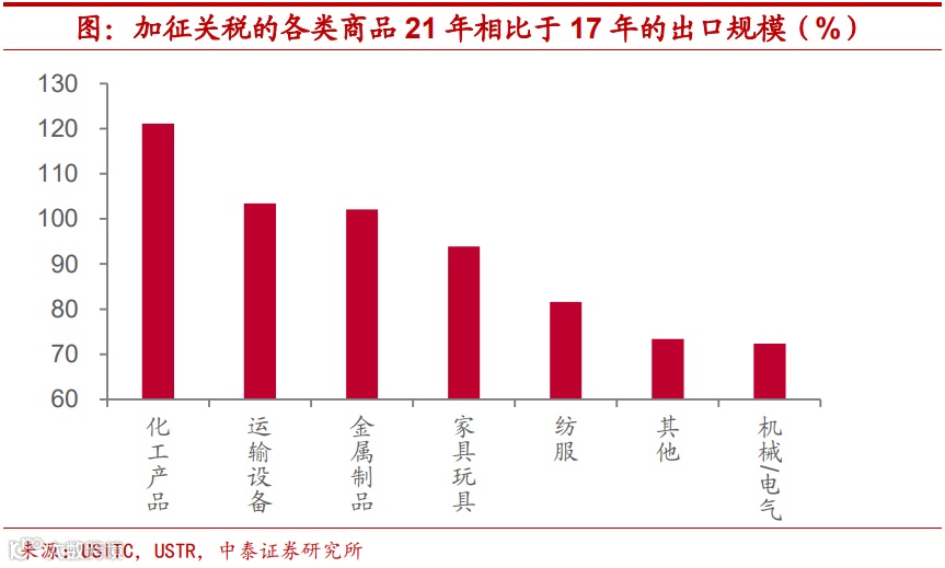 化工、交运设备已然恢复,机械电气设备仍有差距。从美国加征关税清单上的各类商品规模变化来看,2018-2019年各类商品进口增速均有持续下行,除纺织服装增速尚录得-20%左右外,多数品类美国自我国进口增速跌幅达到-40%。而到2021年,化工产品、交运设备和金属制品三类清单上的商品,美国自我国进口规模已经恢复到中美贸易摩擦加剧前2017年时的水平,但家具、纺服和机械电气设备仍较摩擦前有一定差距,其中占比最大的机械和电气设备只有摩擦前七成左右。