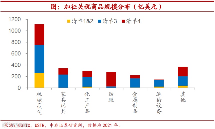 机械电气设备超40%,几轮清单均有涉及。从各类商品的分布上来看,我们发现,四批清单合计下来,加征关税商品多数集中在机械和电气设备,其在清单商品中的规模占比要超过40%,在多批清单中均有涉及,但考虑到这也是我国出口到美国的商品中占比最大的品类(47%左右),因此这一比例并不算高。相对于各自的对美出口份额来看,征税清单在交运设备、纺织服装和金属制品等商品上的分布较为突出。