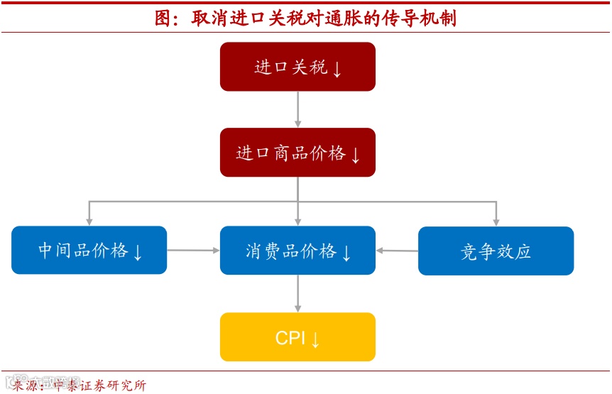 税率降低影响通胀,主要存在三种途径。关税税率的提高,在制约我国对美出口的同时,一定程度上,其实也推高了美国国内的商品价格。从传导机制上来看,关税税率的变化主要通过最终消费品价格、中间投入品价格以及竞争效应三种途径影响通胀。首先,降低进口关税税率后,用于最终消费的进口商品价格也会随之回落,直接作用于CPI增速。其次,部分进口商品作为投入品使用,这部分价格的回落,在进入生产过程后也会间接压降产成品的价格水平,进而带动CPI增速的下降。最后,由于进口商品价格下降,国内生产商出于竞争考虑,也会相应地调降国产商品价格。