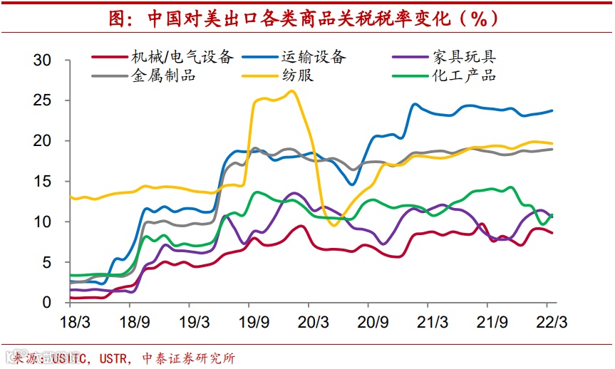 关税税率实际水平,交运设备提升最多。考虑到部分商品的关税豁免,如果进一步考察我国对美出口商品实际关税税率的变化。我们发现,从我国对美出口各类商品关税税率水平上来看,占我国对美出口规模约3.3%的交通运输设备,关税税率上升幅度最大,税率提高约20个百分点,而占对美出口规模47%的机电设备、10%的化工产品以及7%的纺织服装,其平均关税税率大约提高6-8个百分点。