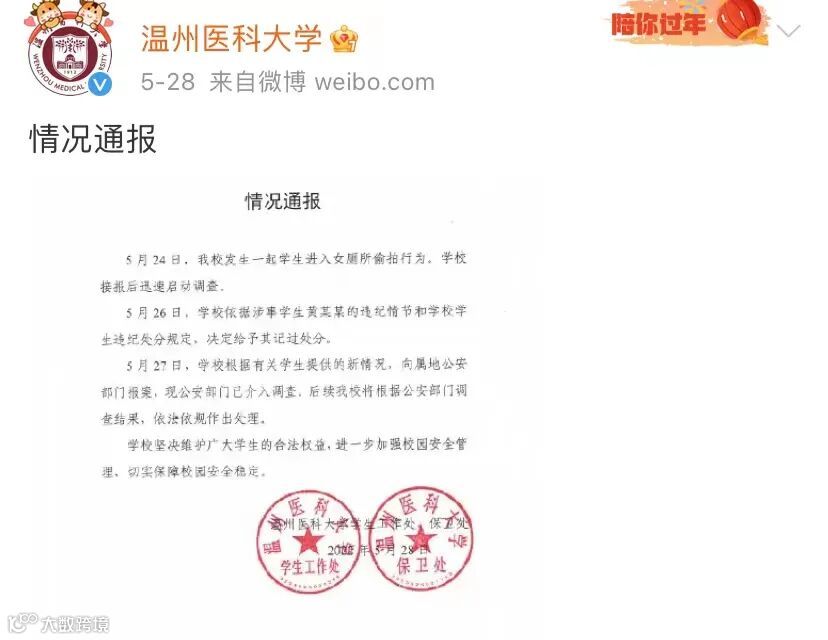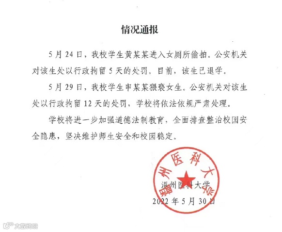 5月31日凌晨,温州医科大学(以下简称“温医大”)官方微博发布情况通报,该校一名学生猥亵女生,被公安机关处以12天行政拘留的处罚。另一名学生进入女厕偷拍被处以5天行政拘留的处罚,目前该生已退学。
