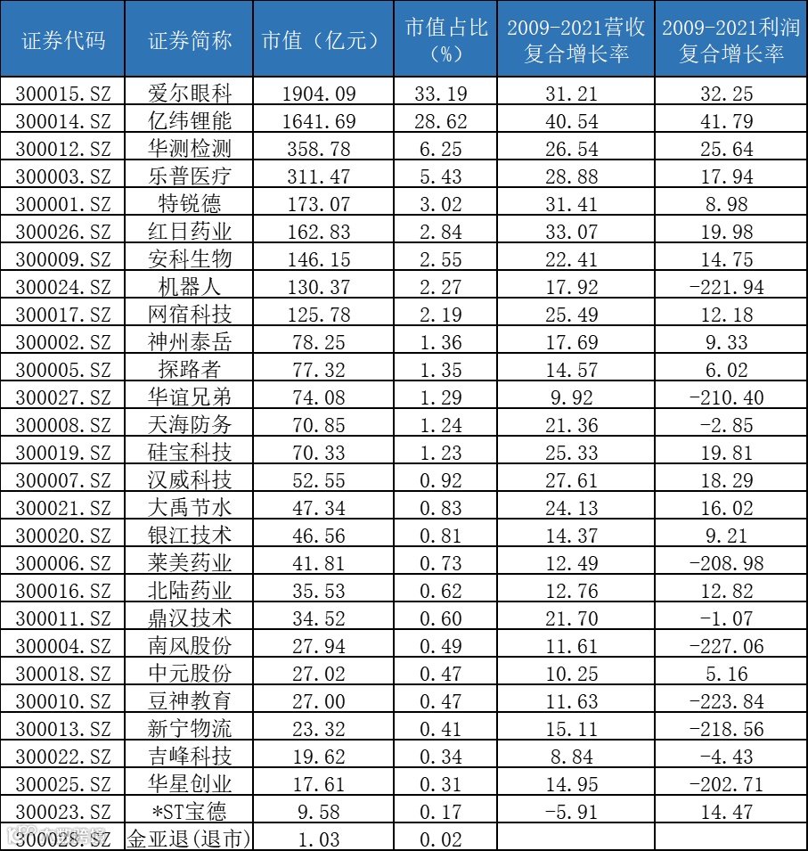事实上, 我们可以看到创业板首批上市公司表现出了明显的“二八效应”,也就是少数公司创造了绝大多数价值,我们看到前两家公司贡献了如今28家公司总市值的60%,而前6家公司贡献了79.35%的市值占比。事实上我们也看到了爱尔眼科、亿纬锂能、华测检测等股票在上市之后完成了10倍、20倍甚至30倍以上的涨幅,背后来源是持续的业绩成长,这三家公司也是唯三的在过去12年中做到了25%以上利润复合增长的少数赢家。