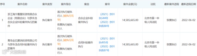 6月6日,司法信息显示,罗永浩近日新增两条被执行人信息:其中一条执行标的为14585665元,案由罗永浩与青岛金石灏汭投资有限公司的合同纠纷案;另一条执行标的14585665元,案由罗永浩与浙江海宁嘉慧投资有限合伙企业纠纷案。两条执行标的合计超2900万元,执行法院均为北京市第一中级人民法院。
