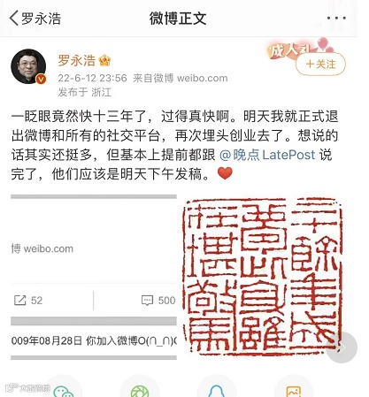 12日深夜,罗永浩发文称:一眨眼竟然快十三年了,过得真快啊。明天我就正式退出微博和所有的社交平台,再次埋头创业去了。