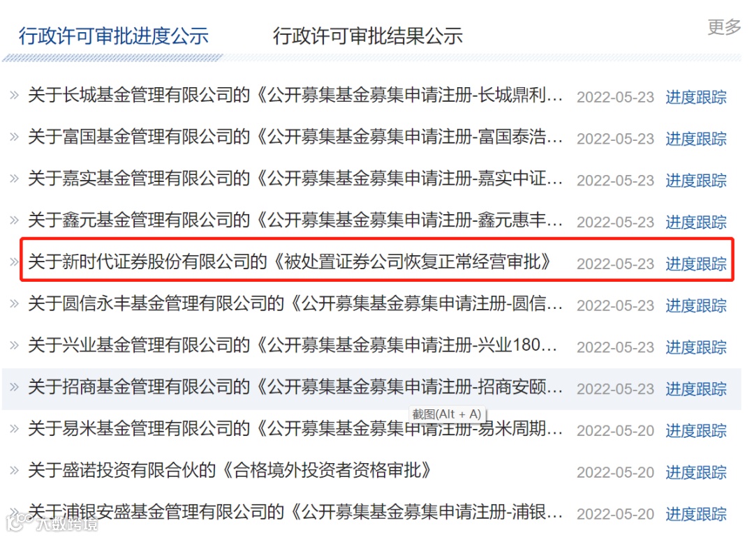 证监会官网信息显示,新时代证券递交的《被处置证券公司恢复正常经营审批》的申请材料,已于5月23日被证监会接收。