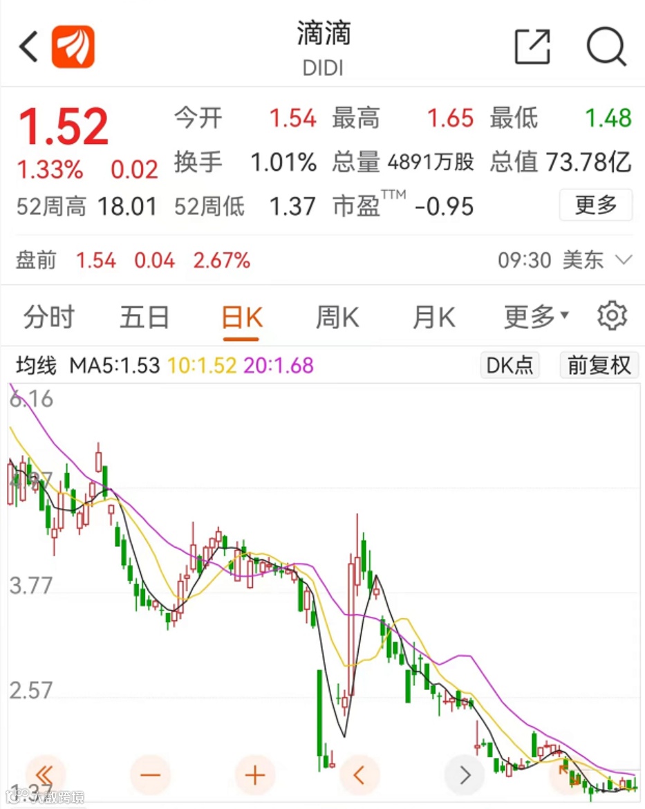 当晚美股开盘后,滴滴美股高开,截至北京时间晚23时,滴滴上涨逾1%,总市值为73.78亿美元,约合人民币491亿元。自去年6月30日上市以来,滴滴股价一度冲高至18美元,市值一度高达870亿美元,折合人民币约5800亿元。