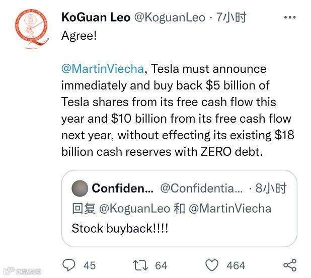 周四,廖凯原在社交媒体上向特斯拉投资者关系高级总监Martin Viecha喊话:特斯拉必须立即宣布,今年回购50亿美元的特斯拉股份,明年回购100亿美元的特斯拉股份。廖凯原表示,用于回购的资金来源为公司的自由现金流,从而避免动用公司现有的180亿美元现金储备。