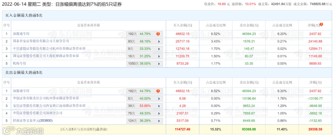 6月14日盘后龙虎榜显示,当日,净买额靠前的席位中包含深股通及一家机构,买五的机构席位当日净买入约8700万元。