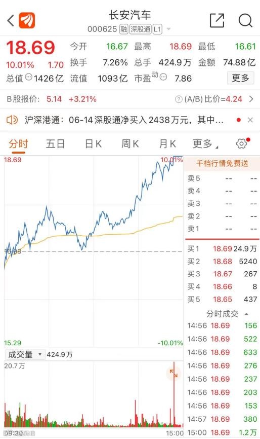 6月14日,长安汽车低开后一路走高,尾盘封涨停,收于18.69元,最新总市值达到1426亿元。