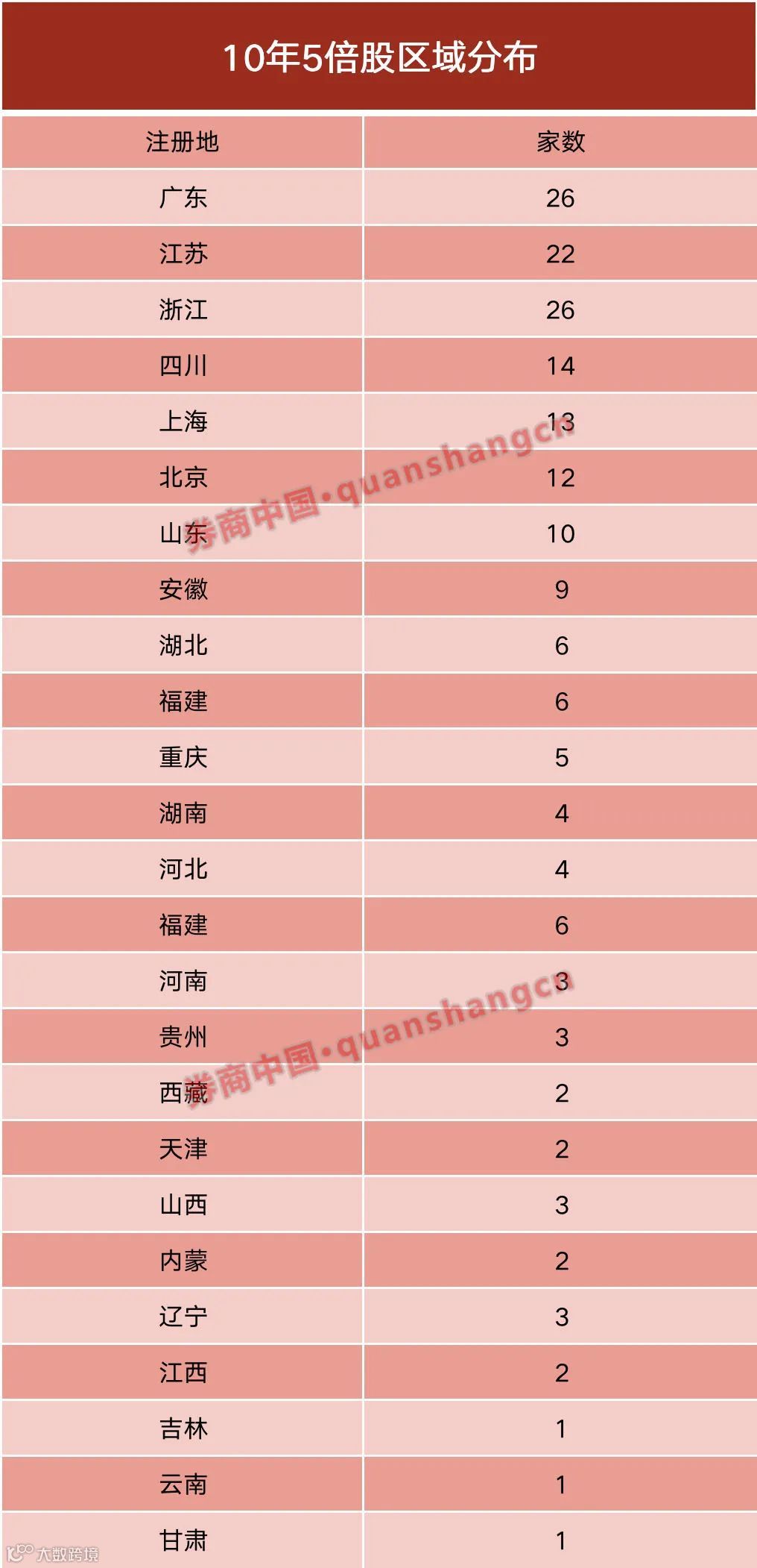 牛股其实就在身边。券商中国·投资小红书统计数据显示,过去十年,A股有185只涨幅高达5倍以上的个股,这些“十年五倍”股占到具有可比数据股票的3.07%,牛股们分布在25个省市自治区中,即使中西部地区依然不乏牛股。