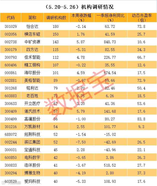 近一周机构调研个股数量有300多只,怡合达成为调研机构数量最多的股票。