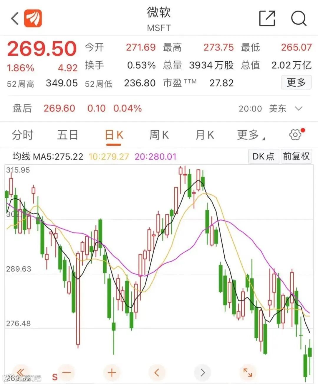 当天,微软公司股价报收269.50美元,上涨1.86%,最新市值超过2万亿。