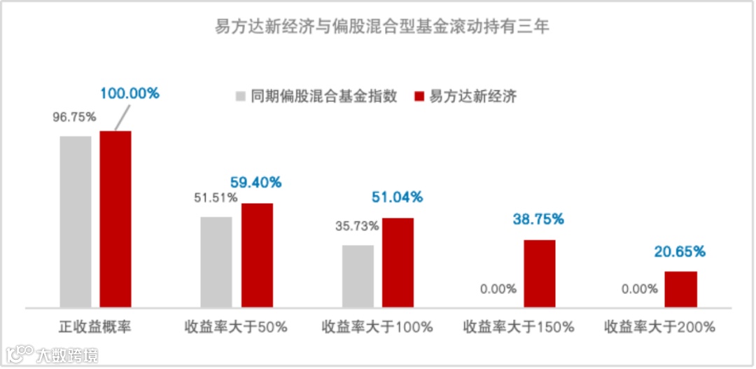数据能更直观地体现这种效果。以易方达科翔、易方达新经济两只陈皓管理超过三年的偏股混合型基金为例,通过回测可以发现,自陈皓任职基金经理以来,在市场3100点左右买入并持有三年,有极高的概率获得正收益。