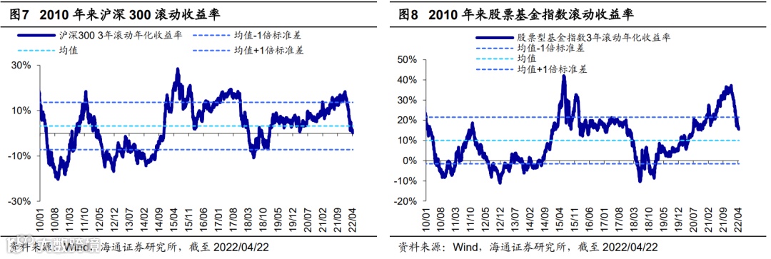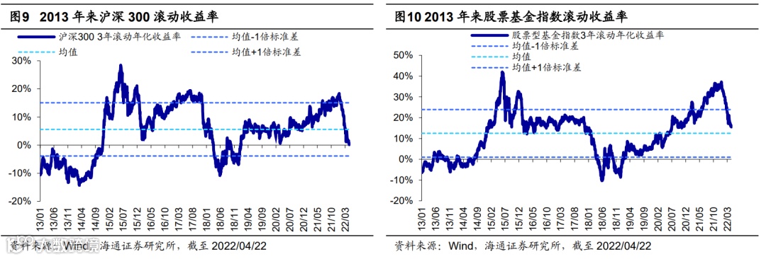 均值回归角度分析,基金净值和指数的年度跌幅有望收窄。参考3年滚动收益率的数据,可以发现目前基金净值和沪深300的跌幅已经很可观。我们分别选取上一轮牛市起点2013年和时间更长的2010年为起点,计算沪深300和普通股票型基金指数的3年滚动年化收益率。截至2022/04/22,以2010年(13年)为起点,沪深300指数3年滚动年化收益率均值为3.2%(5.6%),目前沪深300最新的3年滚动年化收益率为-0.1%,处于均值以下的水平,假设指数3年滚动年化收益率在今年底回归均值,那么年底时沪深300相较当前点位的涨幅须达到12%(20%),最终年度涨跌幅为-9%(-2%)。基金方面,2010年(13年)以来普通股票型基金指数 3年滚动年化收益率均值为10.0%(12.5%),目前普通股票型基金指数最新的3年滚动年化收益率为14.4%,处于均值以上水平,假设指数3年滚动年化收益率在今年底回归均值,那么年底时普通股票型基金指数相较当前点位的涨幅须达到0%(7%),最终年度涨跌幅为-23%(-18%)。