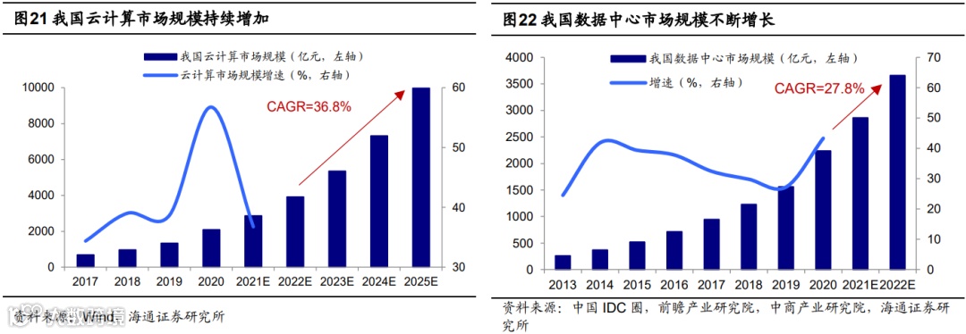 新基建弹性更大,如低碳经济、数字经济。“新基建”首次受到投资者的关注是在2020年,当年3月政治局常委会召开,会议强调在防疫的大背景下,要把复工复产与扩大内需结合起来,要“加快5G网络、数据中心等新型基础设施建设进度”。新基建其实是短期稳增长与中长期经济结构调整的平衡点,随着今年二季度稳增长政策继续推进,新基建相关的增速和弹性更大,尤其是相关行业一季度回调比较明显,二季度潜力更大,比如低碳经济中的光伏风电,数字经济中的云计算数据中心等。4月21日,习总书记在博鳌论坛上发言,指出中国将积极推进加入《数字经济伙伴关系协定》。根据海通电新组预测,2022年我国风电新增装机同比增长约50%,光伏新增装机增长超50%。根据《“十四五”数字经济发展规划》,预计20-25年数字经济核心产业增加值的CAGR达14.1%;根据发改委的数据,今年以来全国10个国家数据中心集群中,新开工项目25个,数据中心规模达54万标准机架,带动各方面投资超过1900亿元,其中,西部地区投资比去年同期增长6倍。根据中国信息通信研究院《云计算白皮书》的预计,22-25年期间年云计算市场规模复合增速将高达36.8%。