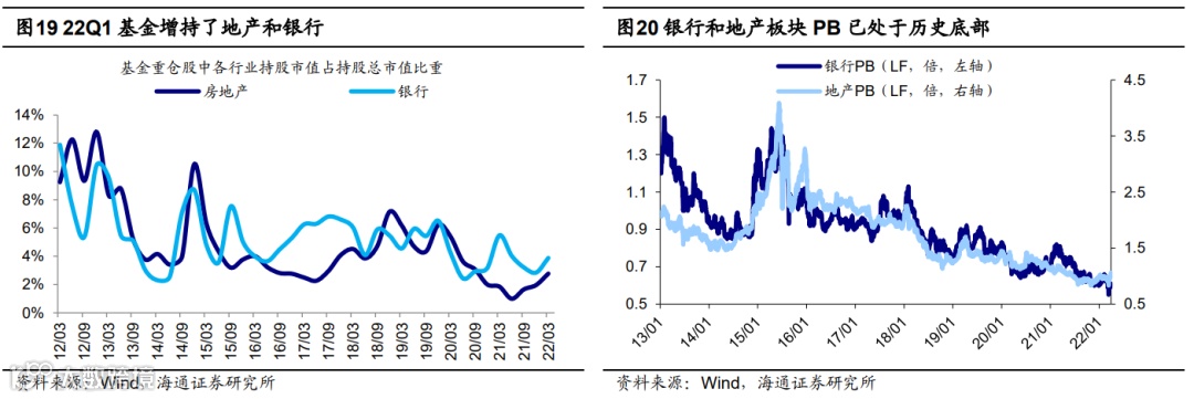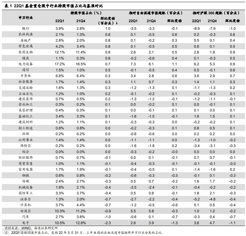 此外从基金对行业的增减配角度来看,22Q1基金增配较多的行业大多集中在价值类板块,例如银行(持股市值占比环比上升1.0个百分点)、农林牧渔(0.8)、房地产(0.8)、有色金属(0.8)、煤炭(0.8)等,而对成长类板块减配较多,例如电子(持股市值占比环比变动-2.3个百分点)、计算机(-0.7)、军工(-0.4)、传媒(-0.3)等,可见基金的行业配置更均衡。