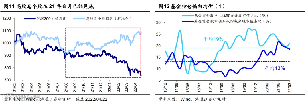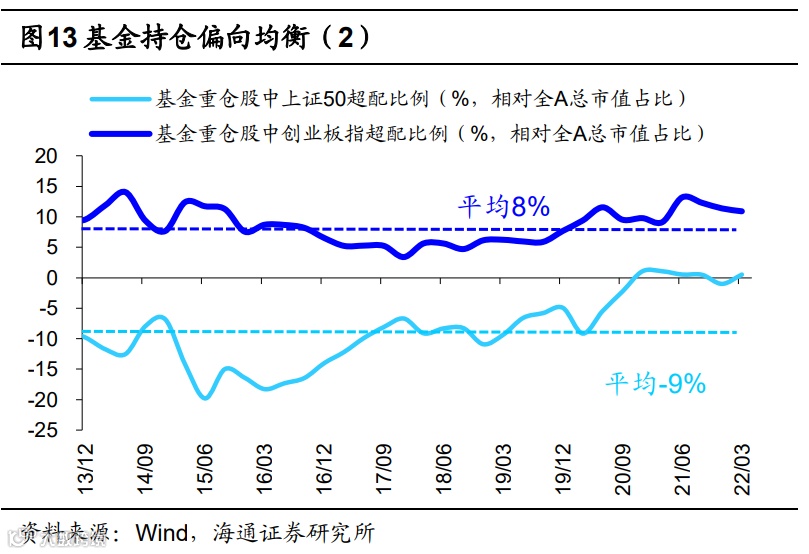 22Q1基金持仓结构已经偏向均衡。其实重仓股之所以在指数见底前后跌幅更大,背后的原因主要源自于基金的持仓结构较为集中。而从近期的情况来看,基金的持仓结构已在偏向均衡。具体而言,由于成长风格在19-21年持续占优,因此过去基金的持仓结构中成长股的占比持续提高。我们以创业板指大致代表成长股,创业板指成分股在基金持股(重仓股口径)中的占比从18Q3最低的8.0%升至21Q2最高的21.8%,至22Q1基金季报已降为18.6%,相较21Q4环比下降了0.8个百分点。对比创业板指市值/总市值、创业板指成分股在基金持股中的占比,计算超配比例,22Q1基金超配创业板指的比例为10.9个百分点,相较21Q4环比下降了0.5个百分点。同样,以上证50大致代表价值股,上证50成分股在基金持股(重仓股口径)中的占比,22Q1为20.9%,相较21Q4环比上升了1.4个百分点,同上,计算超配比例,22Q1为0.5个百分点,相较21Q4环比上升了1.5个百分点。
