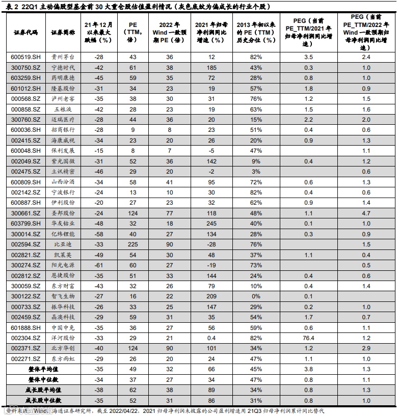 基金重仓股的调整已较为明显,尤其是其中成长类公司估值处于历史偏低。我们在主动偏股型基金重仓股中挑选了前三十大重仓股,这三十大个股占了基金整体持股规模的40%。从调整幅度来看,自21年12月指数高点以来(截至2022/04/22,下同)沪深300最大跌幅为23%,同期22Q1基金前三十大重仓股最大跌幅的均值为35%、中位数34%,基金重仓股的跌幅明显更深,同时2013年以来基金重仓股的PE(TTM,下同)历史分位数均值已经来到了45%、中位数为47%。估值盈利性价比角度,用当前PE(TTM)和2021年归母净利润同比增速计算PEG,目前基金前三十大重仓股PEG的中位数(均值受极端值影响较大)已达到0.8,用2022年Wind一致预期归母净利润同比增速计算的PEG中位数为1.1,因此综合来看整体基金重仓股的调整也已较为明显。此外我们在前三十大重仓股中进一步挑选了属于TMT、军工、新能源产业链、医药等代表性成长行业的个股,这部分个股占了基金整体持股规模的23%。目前基金重仓成长股的PE历史分位数均值仅34%、中位数31%,已经处于较低的区间,同时这些基金重仓成长股的PEG中位数也已经达到了0.8(用2022年Wind一致预期归母净利润同比增速计算的PEG中位数为1.0),估值盈利性价比已经凸显。